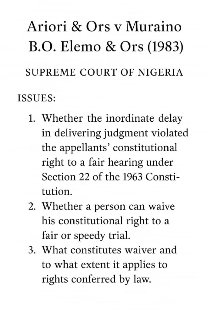 The landmark case of Ariori and Others v. Muraino B.O. Elemo and Others (SC 80/1981), decided by the Supreme Court of Nigeria, stands as one of the most important decisions on the constitutional right to a fair and speedy trial, the concept of waiver of fundamental rights, and the proper course for an appellate court when a trial judge delays judgment for an inordinate period.