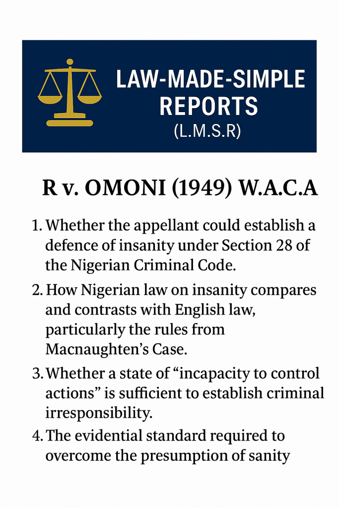Sunday Omoni was convicted of murder by the Supreme Court in Port Harcourt. During the trial, the defence of insanity was raised. While this defence was not formally part of the appellant’s grounds of appeal, the Court allowed counsel to argue the question.