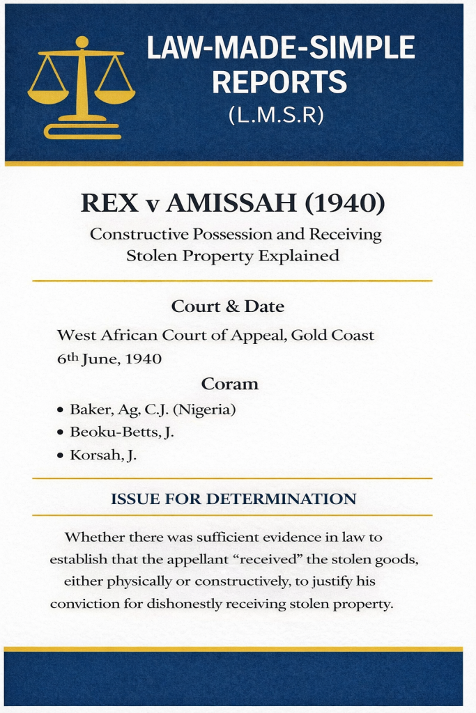In summary, this case Rex v Amissah (1940) remains a foundational case in criminal law, reinforcing the principle that mere involvement or expectation is not enough to establish receipt of stolen property. The prosecution must prove clear possession either physical or constructive before a conviction can be sustained.